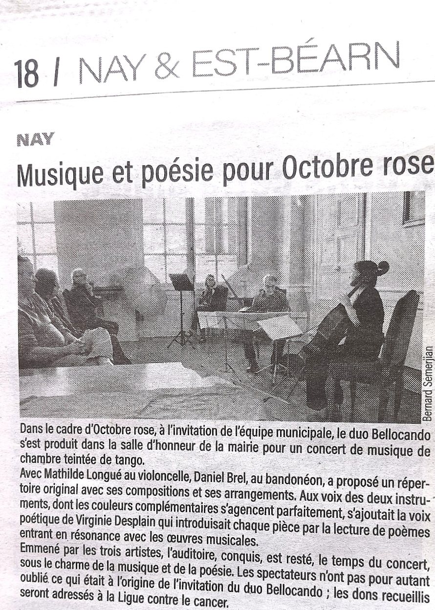 Merci à la mairie de Nay pour avoir organisé ce moment de partage dans le cadre d’octobre rose, merci à Bernard Semerjian pour ce bel article dans la République des Pyrénées et merci au public présent ! 🙏