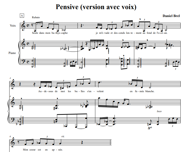 Pour mieux comprendre, jetez un coup d’œil à ce début de partition (je ne vous livre ici qu’un bref aperçu, je vous ai prévenu ce n’est qu’une courte visite). Le morceau, à caractère jazz, s’appelle « Pensive ». Il est écrit pour piano et voix de femme. En écoutant cette musique, en ressentant son rythme lent et oscillant, je me suis sentie transportée loin de tout, dans un univers inconnu et mystérieux. Le fond des océans m’est alors apparu comme le cadre idéal d’une telle rêverie et j’ai construit mon texte autour de ce thème.