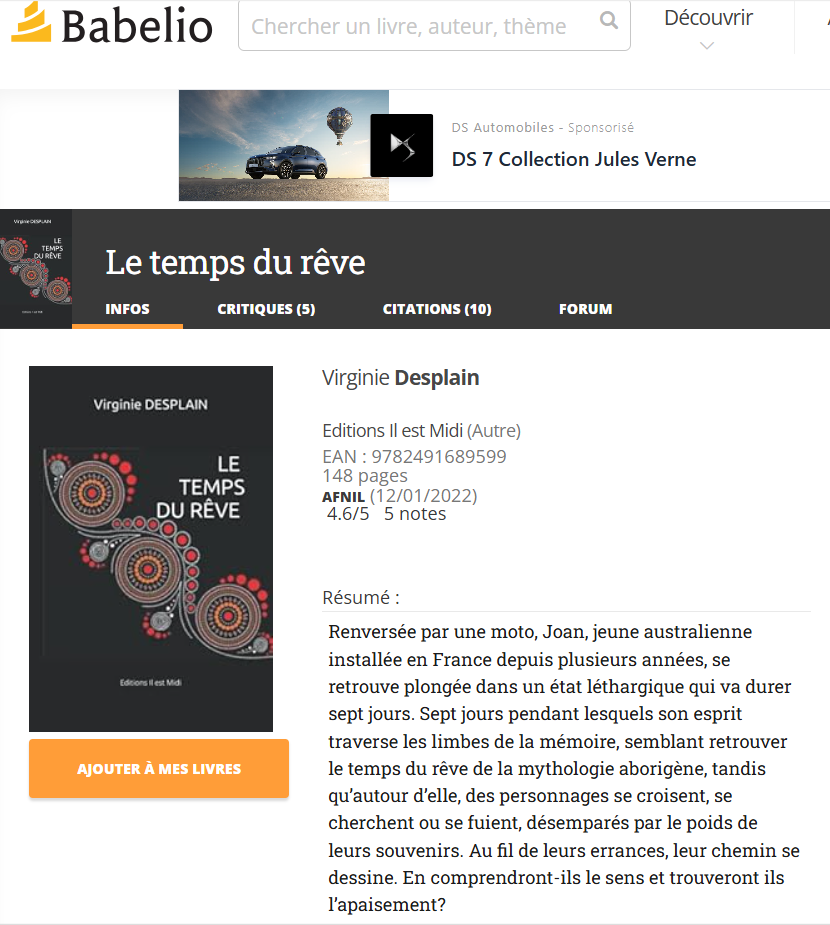 Pour l’instant mes deux premiers romans, « Des ronds dans l’eau – Edilivre » et « Le temps du rêve, édités en 2014 et en 2022 sont hélas uniquement disponibles sur commande sur les sites en ligne et leur promotion repose principalement sur moi.